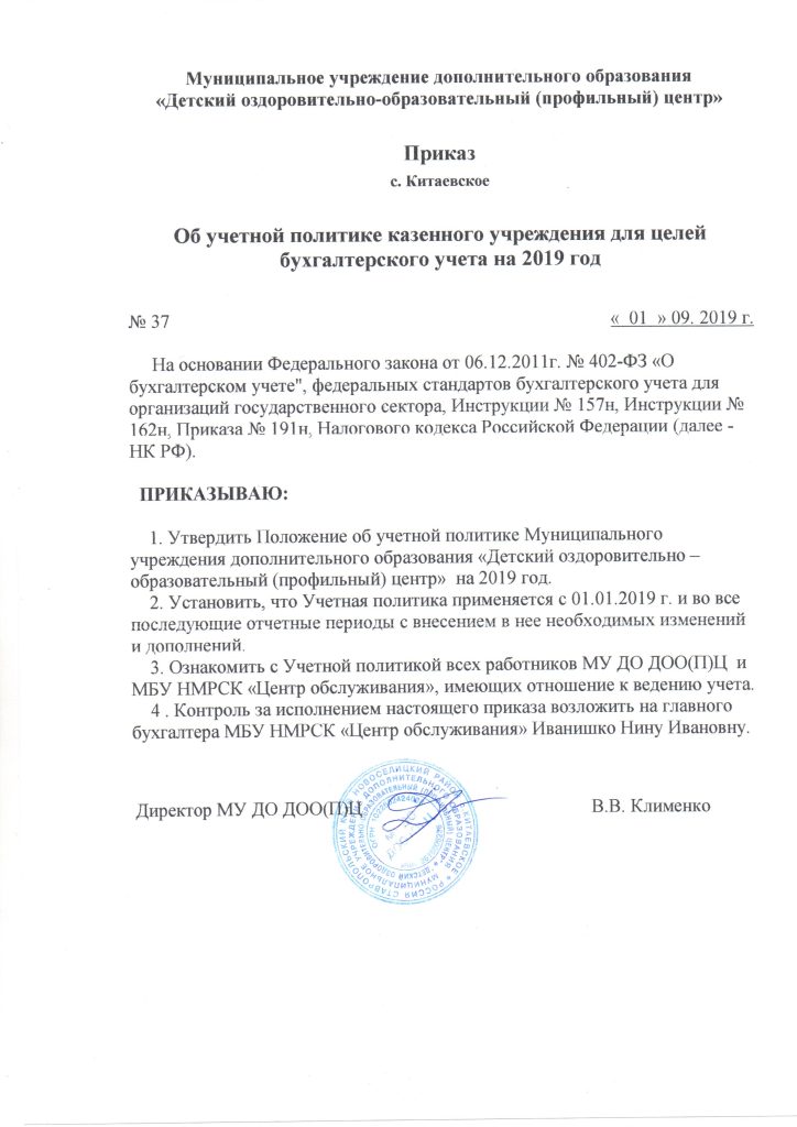 Приказ № 37 от 01.09.2019 г. Об учётной политике